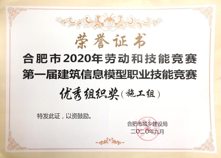 合肥市2020年劳动和技能竞赛第一届建筑信息模型职业技能竞赛优秀组织奖(施工组)