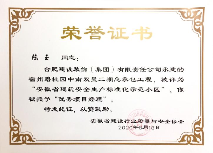 宿州碧桂园中南双玺二期总承包工程——安徽省建筑安全生产标准化示范小区优秀项目经理--陈玉