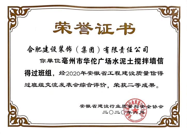 亳州华佗广场基础工程QC小组《提高水泥土搅拌墙成墙质量验收合格率》成果荣获2020年安徽省工程建设质量管理小组成果一等奖