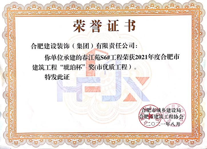 >春江苑S6#--2021年度合肥市建筑工程“琥珀杯”奖(市优质工程)